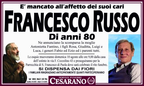 Giorno del rito funebre: 10/08/2025 Luogo il cui si trova la salma: Via Federico Cozzolino, 43 Luogo del rito funebre: Parrocchia di San Francesco di […]